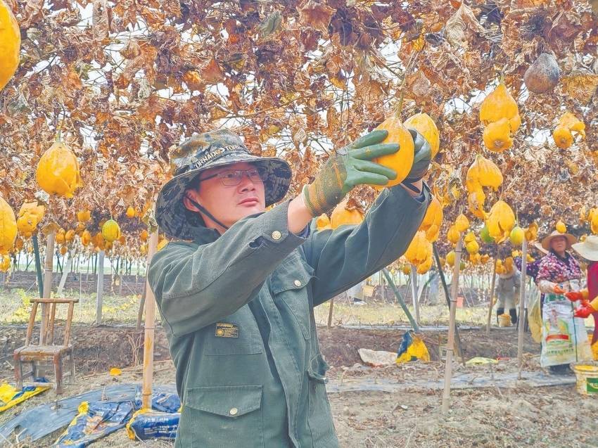 12月10日,走进郑场镇连渔村瓜蒌种植基地,一排排水泥柱撑起的瓜蒌架,连片成网,钻进其中,宛如进入一片金色的果实海洋,一个个金灿灿的瓜蒌圆润饱满,垂挂在藤蔓下,空气中还弥漫着淡淡的果甜味。